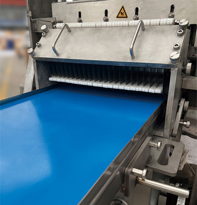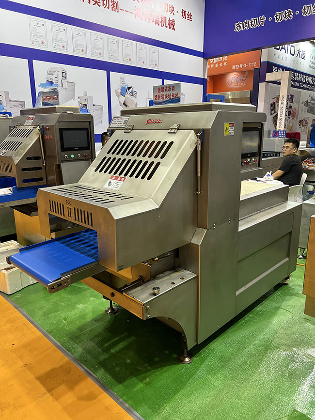 本產(chǎn)品在連續(xù)式切片機(jī)基礎(chǔ)上增加圓形刀組,組成二維切割形式,實(shí)現(xiàn)凍肉切丁切塊功能,連續(xù)式入料切割,流暢切割出成品肉丁肉塊,切塊切丁產(chǎn)量可達(dá)到2-3噸/小時(shí)。整套刀組均采用進(jìn)口材質(zhì)刀片,特殊齒形設(shè)計(jì),使切割更加流暢,成型更加美觀。